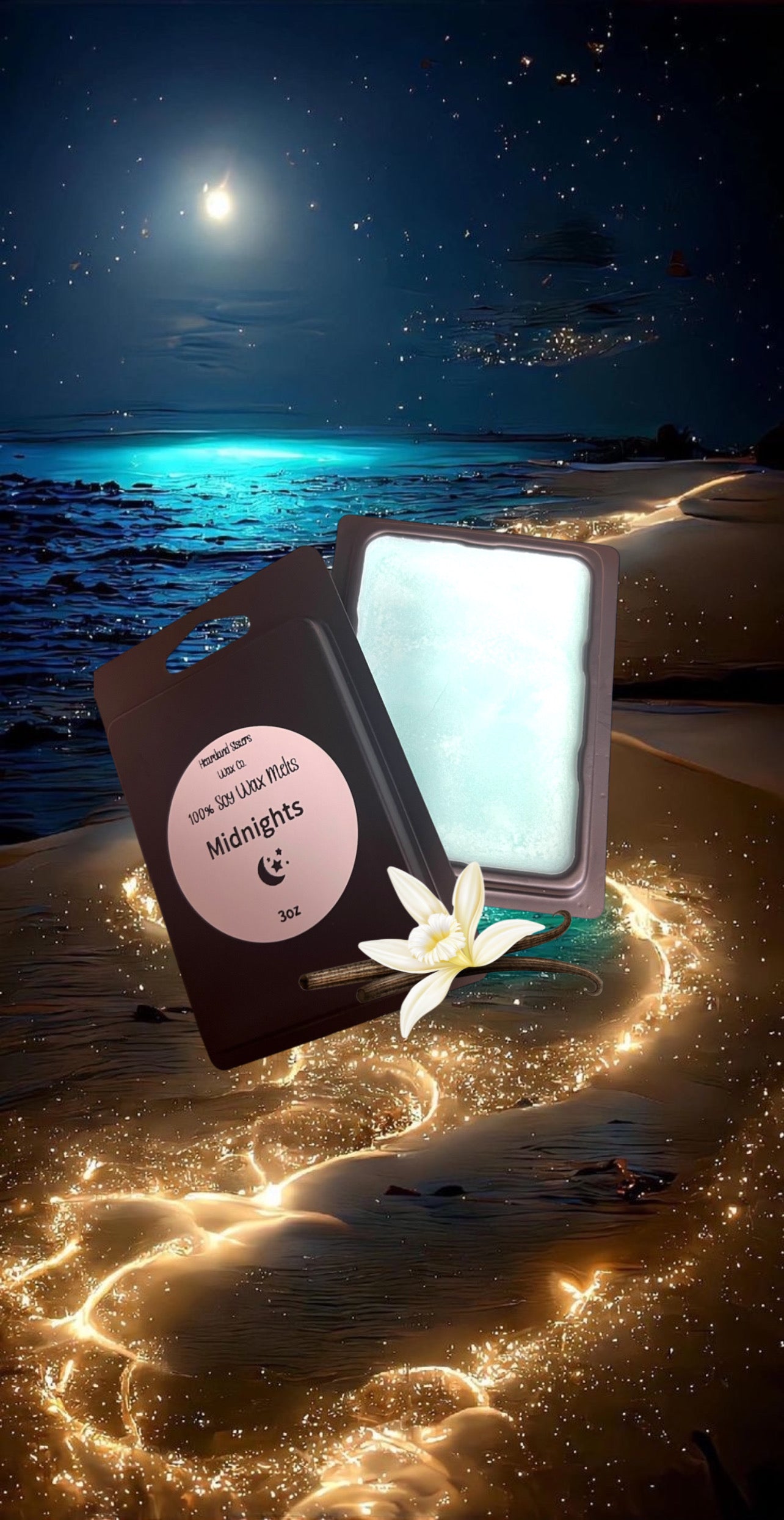 Midnights wax melt 100% soy wax. Scent notes of golden and vanilla, midnights is our best selling scent.